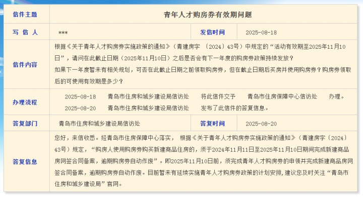 信网8月26日讯近期有市民通过青岛市政府信箱咨询青年人才购房券有效期问题:在此截止日期(2025年11月10日)之后是否会有下一年度的购房券政策持续发放?如果下一年度暂未有相关规划配资炒股炒股,可否在此截止日期之前领取购房券,但在截止日期后买房并使用购房券?购房券领取后的可使用有效期是多少?
