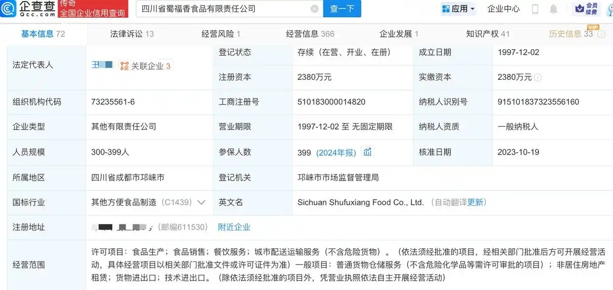 企查查平台信息显示股票交易配资,涉事企业【四川省蜀福香食品有限责任公司】成立于1997年12月,注册资本2380万元,企业类型为其他有限责任公司,参保人数399人,经营范围包含:食品生产;食品销售;餐饮服务;城市配送运输服务(不含危险货物)等。