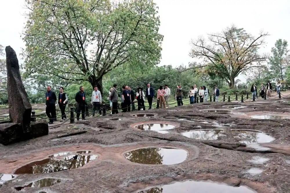 步入景区,护国门巍然矗立于悬崖之畔,门楣之上“护国门”三字历经风雨,雄风不减。媒体团踏着青石板路拾级而上,指尖抚过斑驳的城墙,感受七百多年前那场惊心动魄的旷世守城战。在讲解员的细致解说中,从“独钓中原”的石刻题记到依山就势的城防体系,从蒙军攻城地道的考古遗迹到范家堰衙署遗址的出土文物,一幅壮阔的历史画卷徐徐展开。“这不仅是一处古战场遗址,更是一本立体的历史教科书。”考察过程中,多位总编辑、社长驻足感慨。