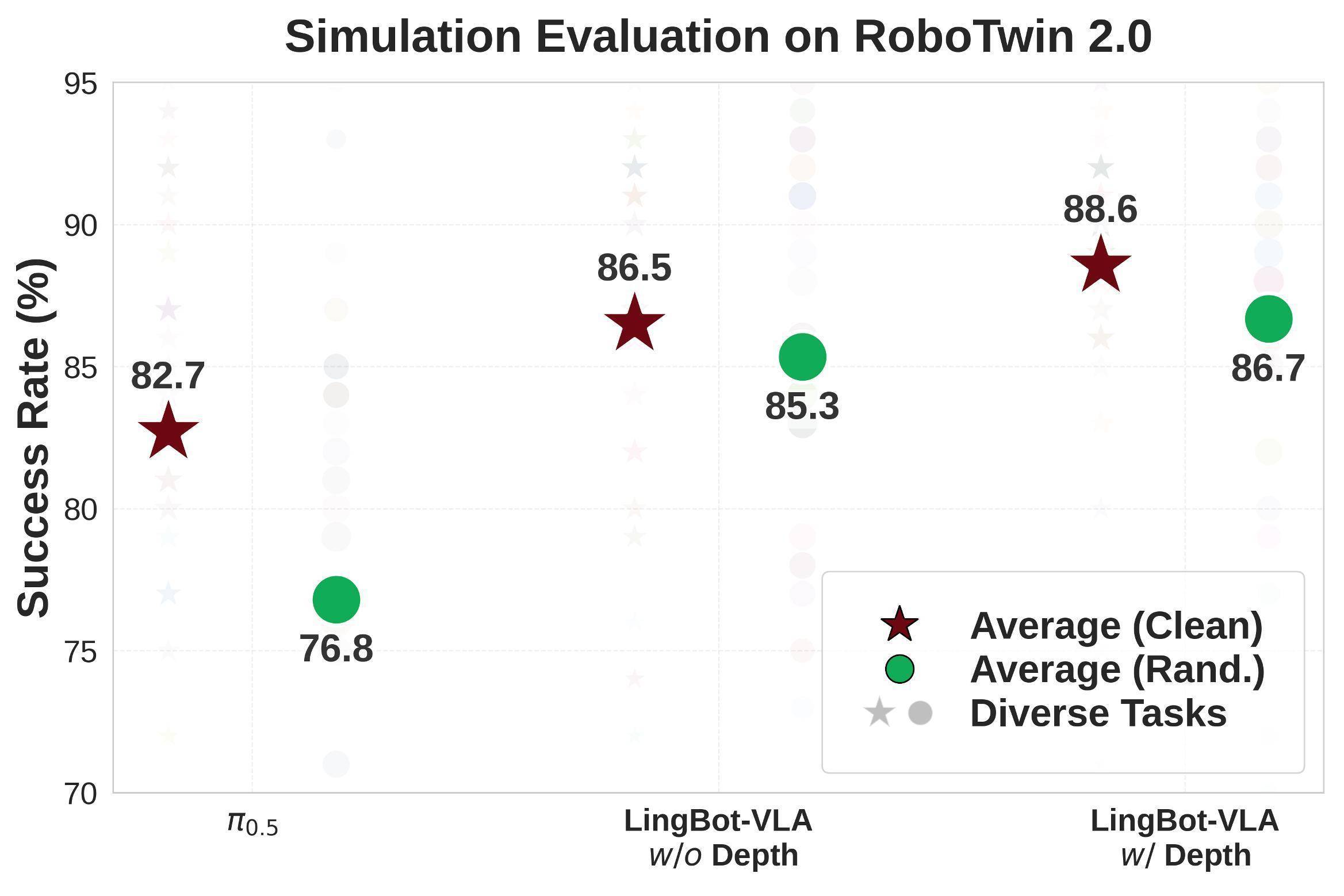 在上海交通大学开源的具身评测基准 GM-100(包含 100 项真实操作任务)测试中,LingBot-VLA 在 3 个不同的真实机器人平台上,跨本体泛化平均成功率相较于 Pi0.5 的 13.0% 提升至 15.7%(w/o Depth)。引入深度信息(w/ Depth)后,空间感知能力增强,平均成功率进一步攀升至 17.3%。