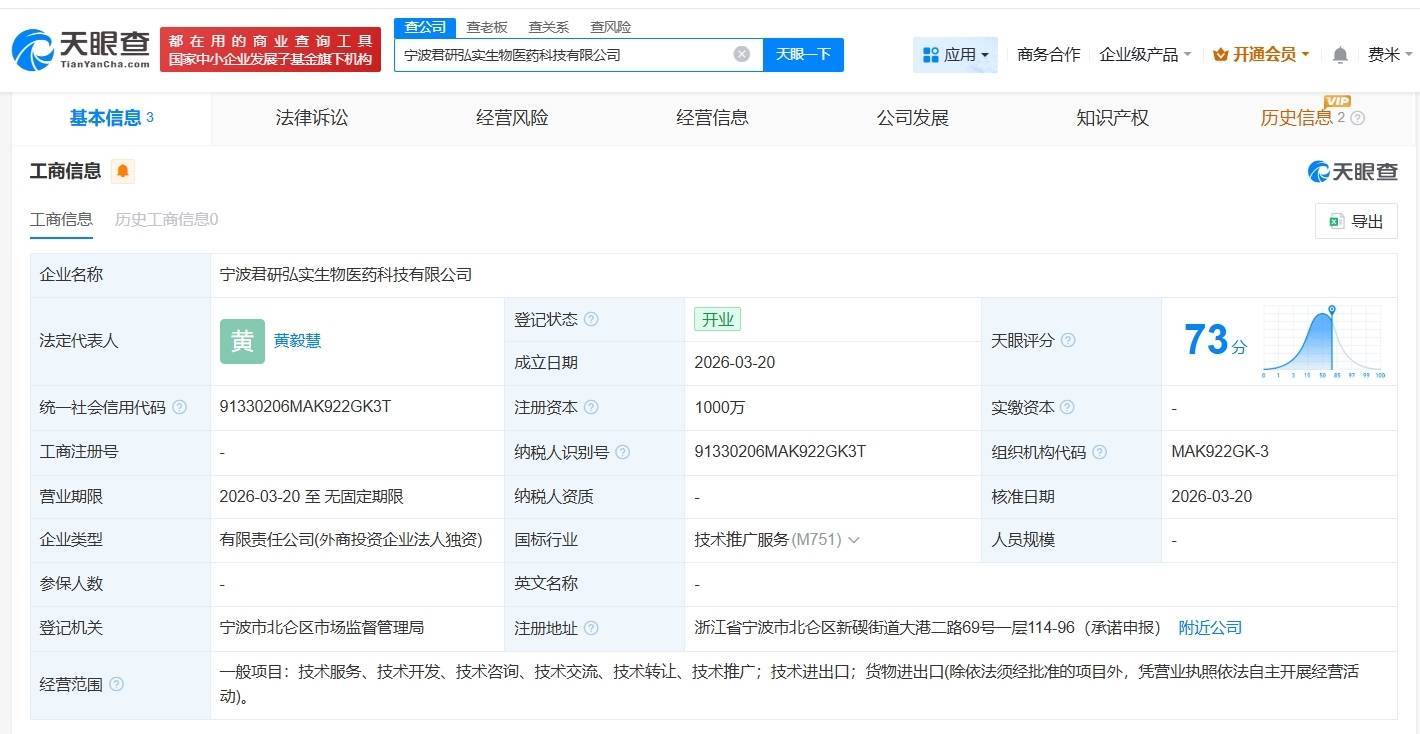 南方财经3月20日电,天眼查App显示,3月20日配资专业证券配资门户,宁波君研弘实生物医药科技有限公司成立,法定代表人为黄毅慧,注册资本1000万人民币,经营范围为技术服务、技术开发、技术咨询、技术交流、技术转让、技术推广,技术进出口,货物进出口。股东信息显示,该公司由君实生物(688180)全资持股。